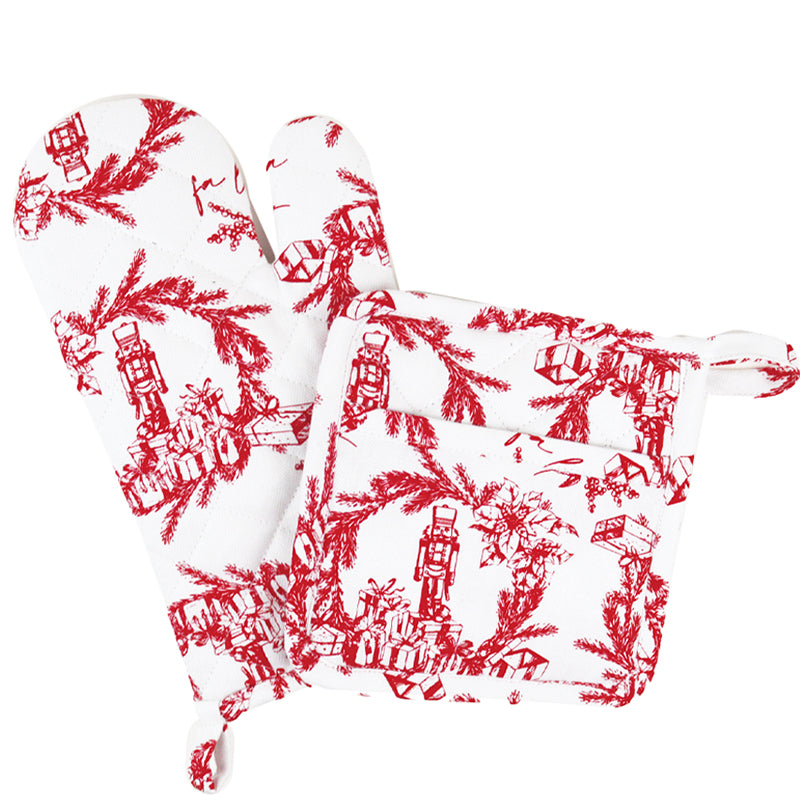 Bring the feeling of festive, yet timeless elegance into your kitchen with our Holiday Toile Red Oven Mitt Set.
