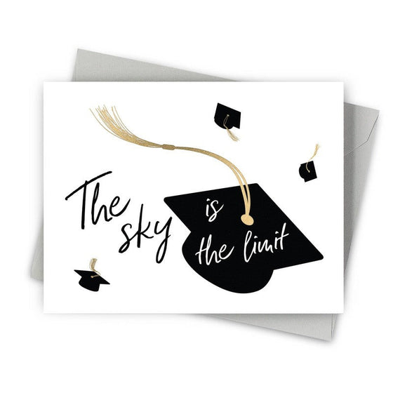 This inspirational graduation greeting card is the perfect way to celebrate a graduate's bright future. Featuring an elegant design with black graduation caps soaring through the air and gold foil tassel accents, it highlights the uplifting message, "The sky is the limit." Ideal for high school, college, or any academic milestone, this modern and motivational card makes a meaningful keepsake. It comes with a coordinating envelope for a polished and thoughtful presentation.