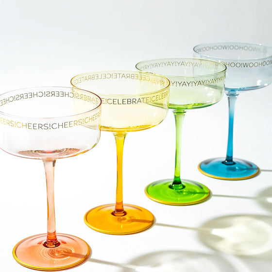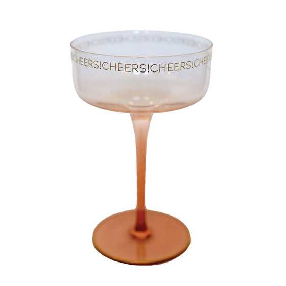11 oz colorful lead-free crystal coupe glass. Hand wash only. Gold inscription repeated around rim of glass reads "CHEERS!"