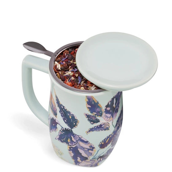 Steep 14 ounces of your favorite loose tea in this single-serve steeping cup, complete with a handle and stainless-steel loose tea infuser. The lid keeps tea warm while steeping and acts as a coaster for your infuser basket when done steeping.
