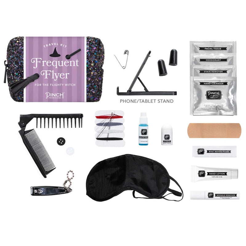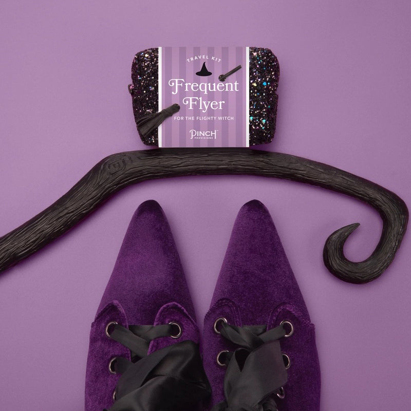 Take your Halloween gifting to new heights with the Frequent Flyer Travel Kit by Pinch Provisions. Wrapped in a dazzling black glitter pouch and adorned with an actual mini witches broom, this kit is a spellbinding essential for during spooky season—and beyond. Inside are 18 travel must-haves to keep your broomstick besties feeling fresh from takeoff to touchdown.