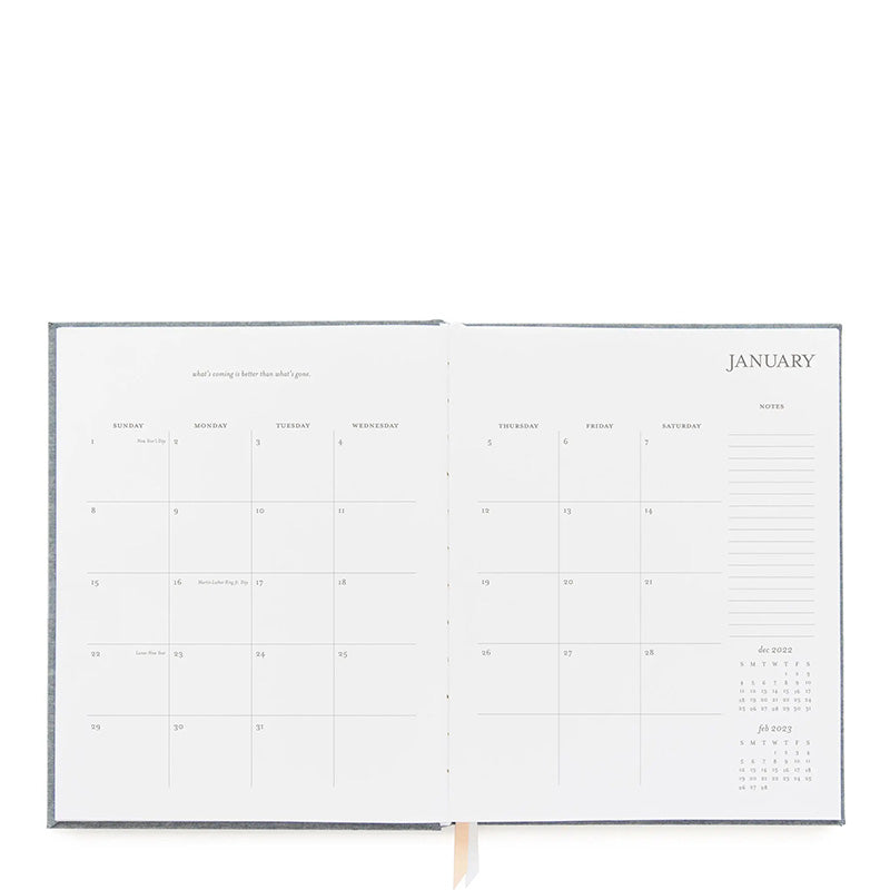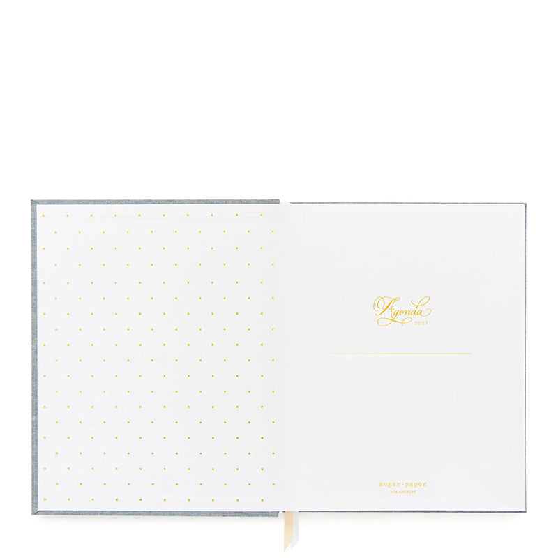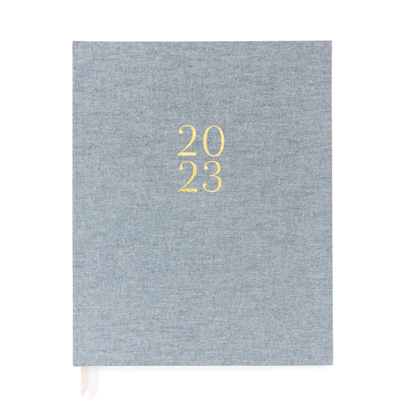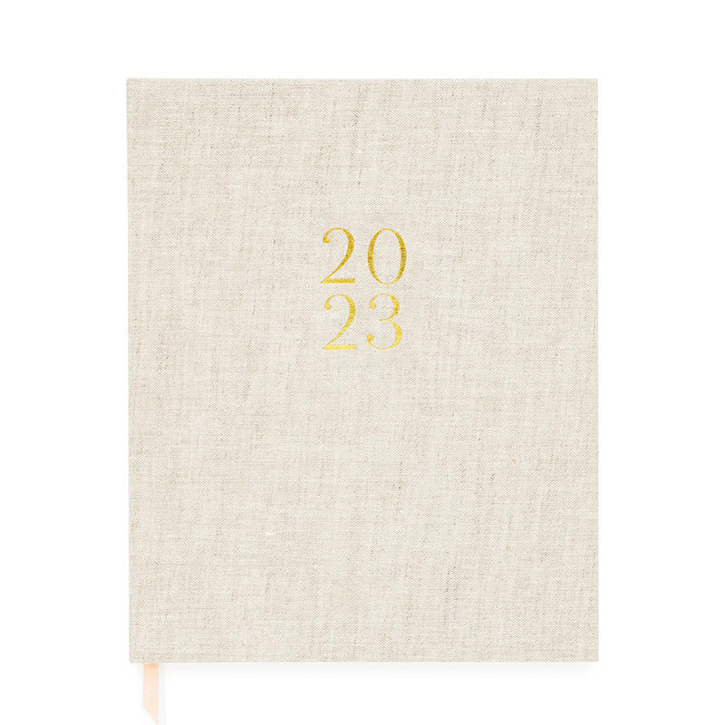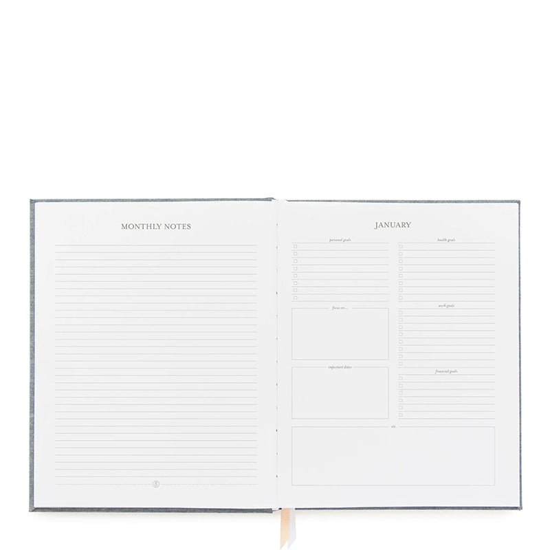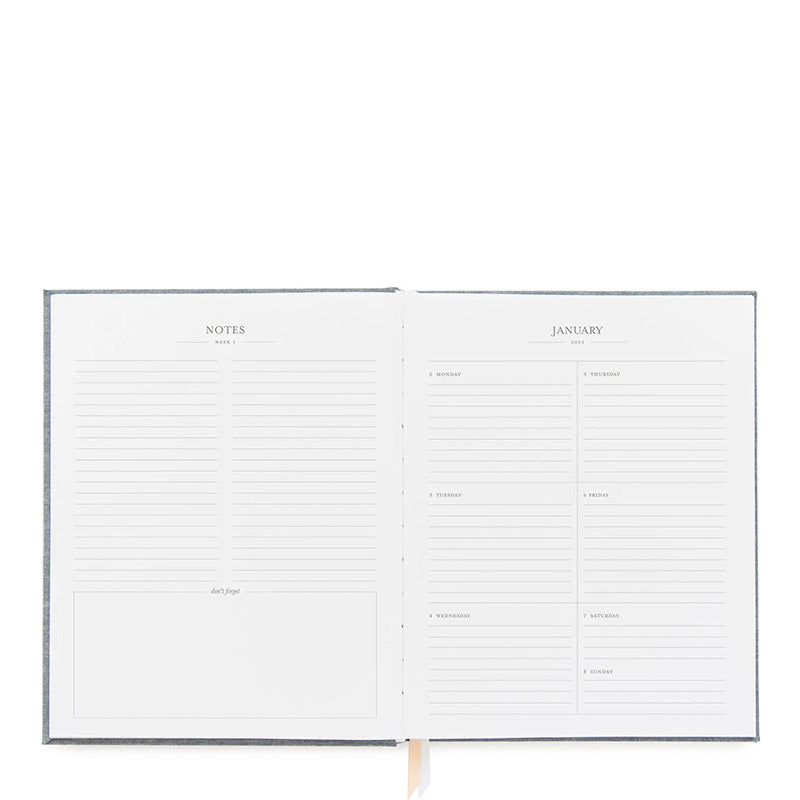 The Desk Planner is a fabric-bound planner with custom gold stamp details. Monthly and weekly sections give proper space for note taking, reminders and thoughtful inspiration for your days.