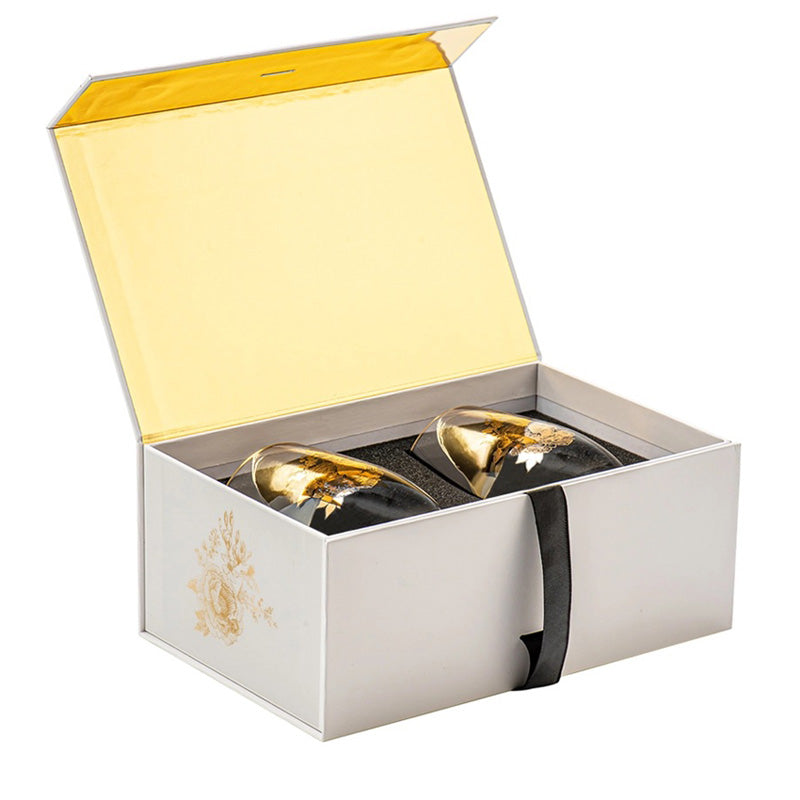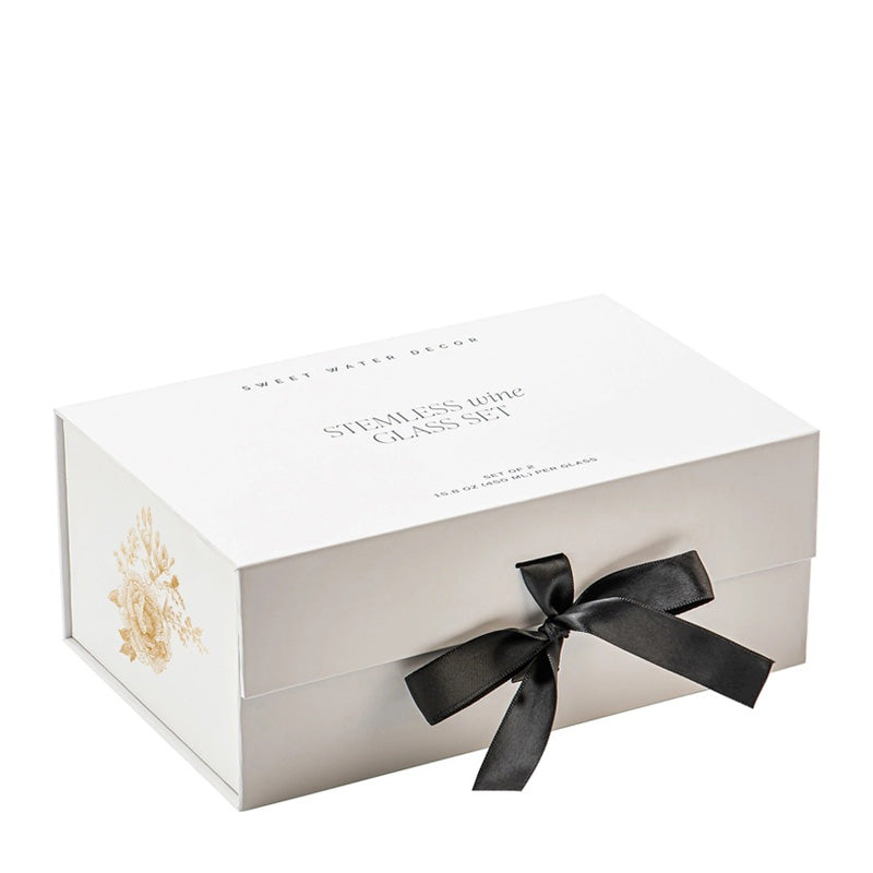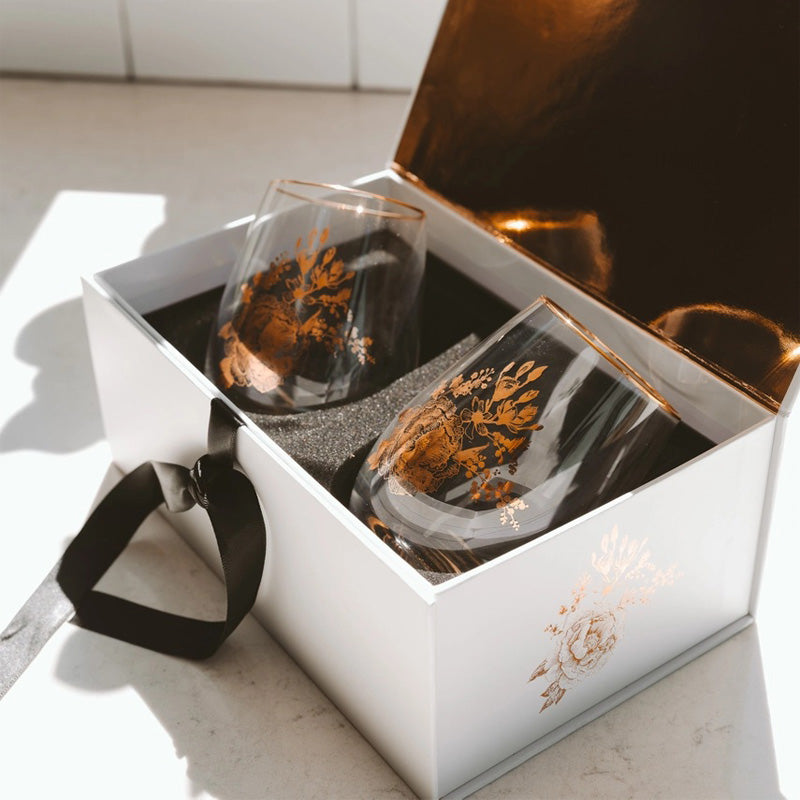 Elevate every toast with our Boxed Set of 2 Stemless Wine Glasses, featuring a classic Delft-inspired design. Each glass is adorned with delicate gold floral patterns, offering a fresh, timeless look that feels right at home on a crisp autumn evening or a breezy summer afternoon. Beautifully packaged in a premium box with a satin ribbon tie closure, this set makes an effortlessly elegant gift. Perfect for bridal showers, wedding celebrations, hostess gifts, or simply treating yourself to a touch of everyday luxury. This set is a thoughtful, timeless gift for every season.