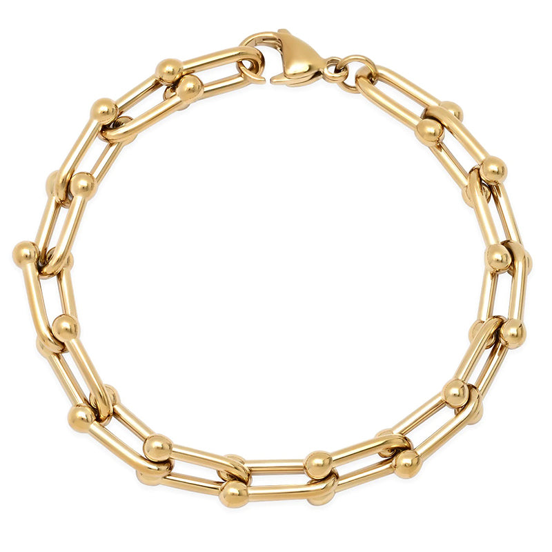 Step up your fashion game with this daring Horseshoe Chain Bracelet! Crafted with gold-plated stainless steel and designed to last, this piece is 7.5 inches of bold style. Take a risk and show off your personality with this stylish accessory!