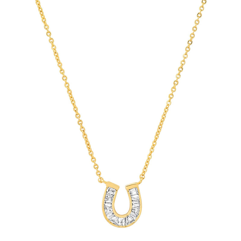 This Lucky Horseshoe Baguette Necklace is a classic piece that strikes a perfect balance between understated elegance and modern glamour. Crafted with a sparkling collection of artfully-cut baguette stones, its timeless design offers a unique yet timeless charm that is sure to turn heads. Effortlessly elevate any look with this luxe and classic piece.