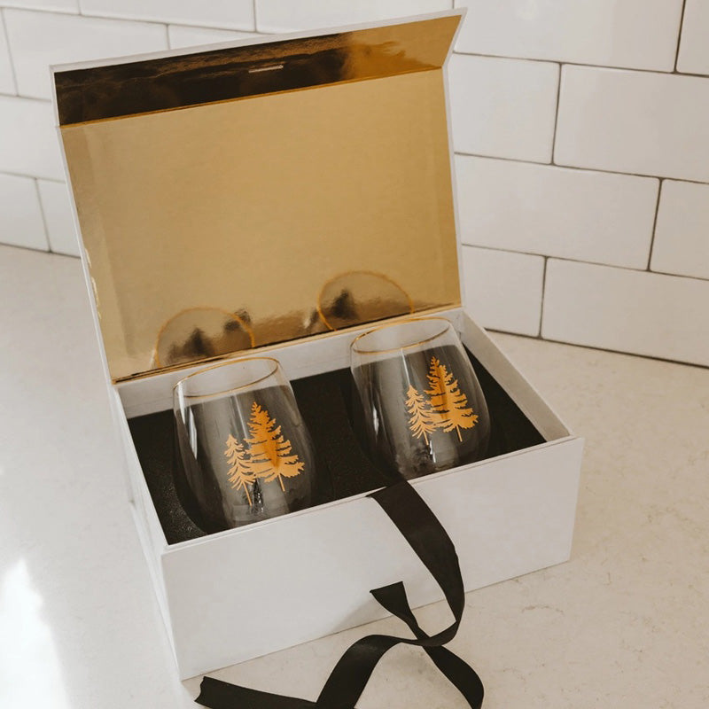 Celebrate the season in style with our Boxed Set of 2 Stemless Wine Glasses, featuring delicate gold tree designs and elegant gold rims. Perfect for winter dinner parties, holiday gatherings, and cozy nights by the fire, these sophisticated glasses add a warm, festive touch to every toast. Beautifully boxed and ready to gift, they’re the ideal way to bring a little shimmer to your seasonal entertaining or to surprise a hostess, friend, or loved one.