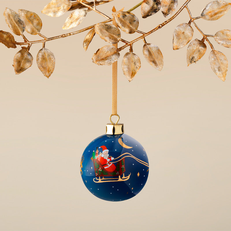 This classic porcelain ornament hangs from a gold ribbon and features an illustration of Santa and his sleigh with gold accents for extra shine.