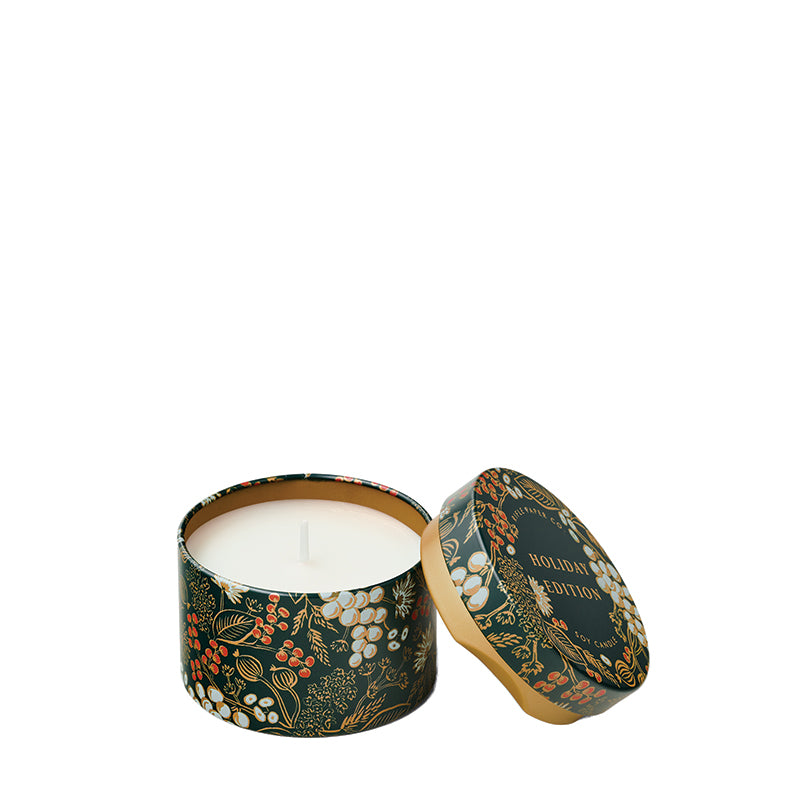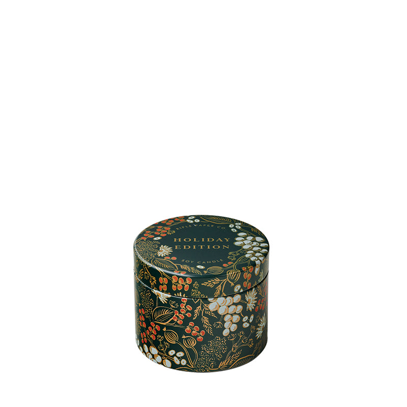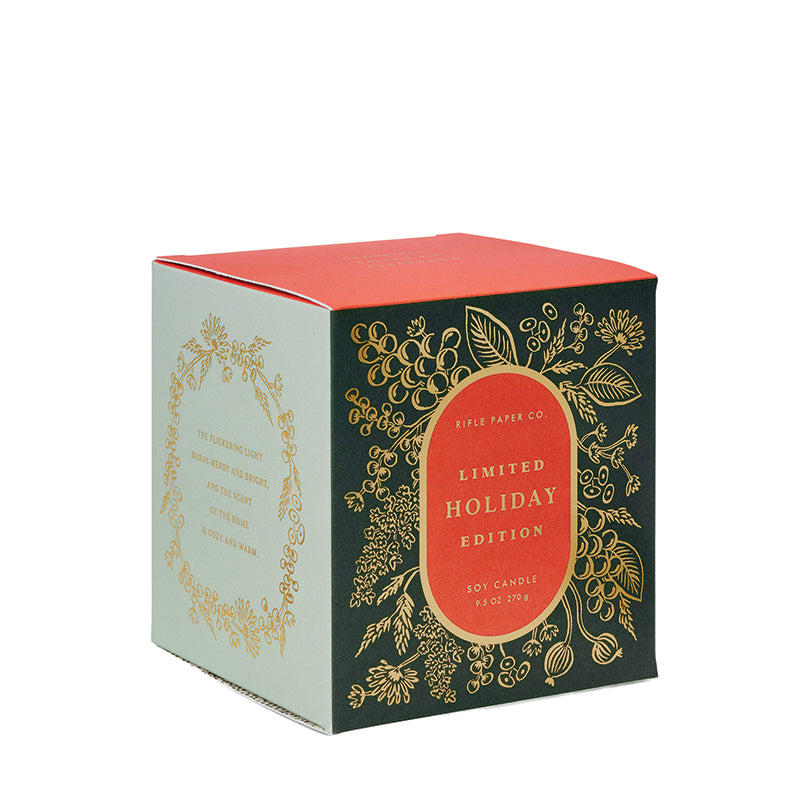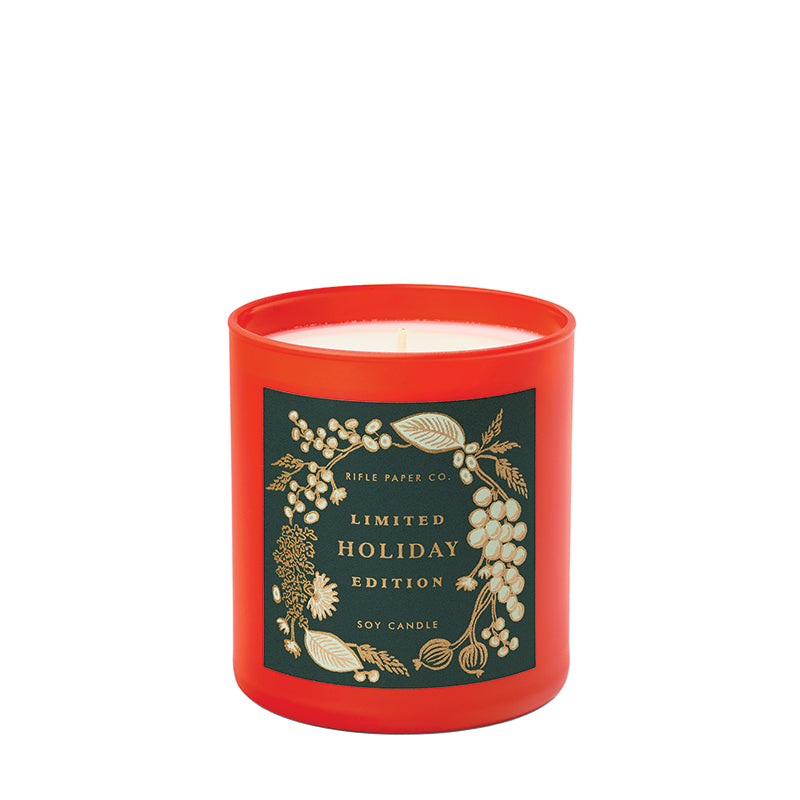 Rifle Paper Co's holiday candle brings to mind memories of cozy nights by the fire, fresh balsam fir trimmings, and boughs of cranberries dipped in frost.