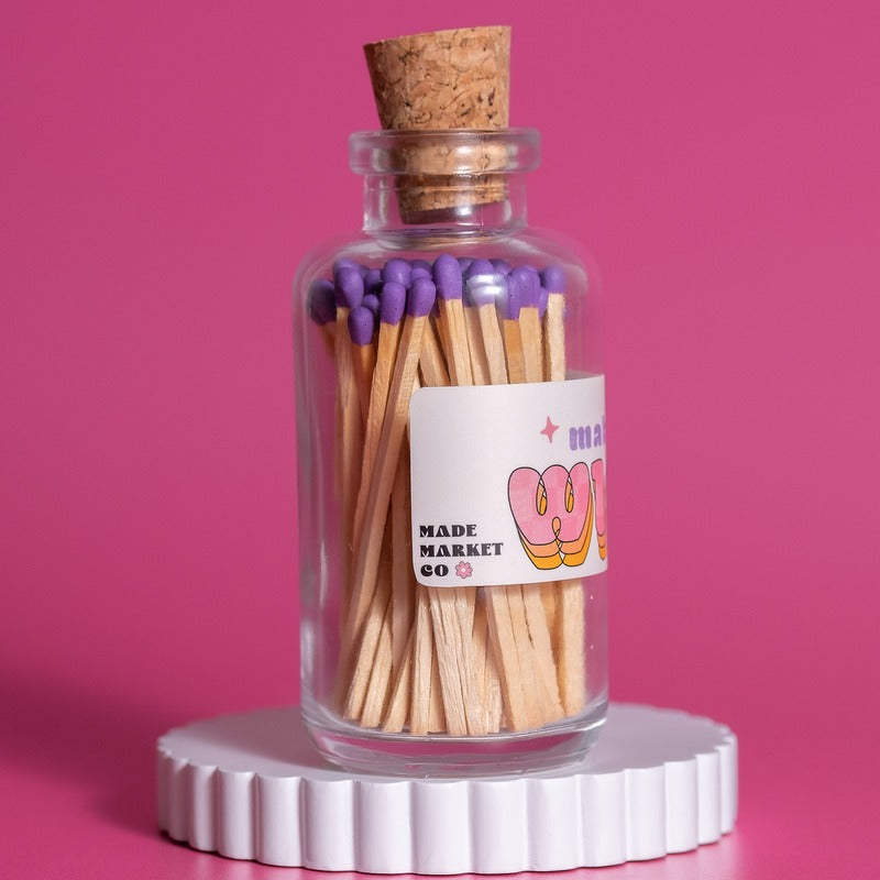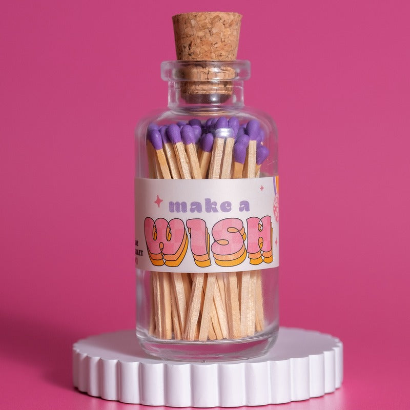 Spark joy and nostalgia with this charming Make A Wish bottle of matches, perfect for birthdays, graduations, and other special occasions that invite you to celebrate life's magical moments. The label, adorned with playful retro graphics, captures the spirit of the groovy era. Practical as well as stylish, the bottle includes a striker for the matches, making it as functional as it is eye-catching. Whether you're lighting candles for a birthday cake or creating a cozy atmosphere, this mini match bottle is a delightful and memorable gift.