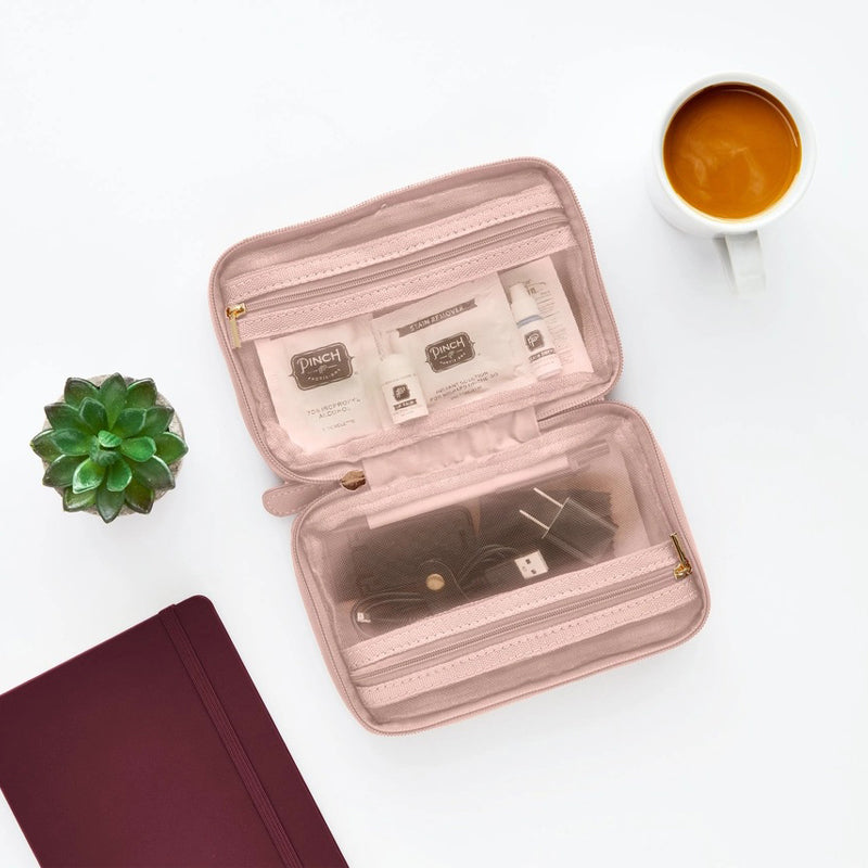 The clamshell blush bag (with two inner mesh pockets for maximum organization) contains 18 essentials for work-on-the-go.