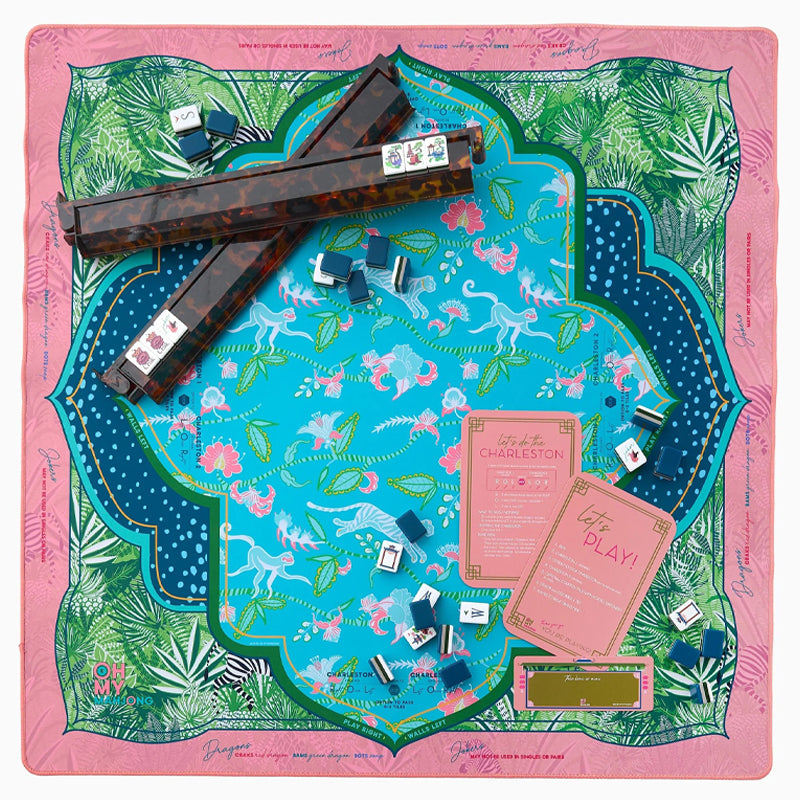 Go wild for the Serengeti Mat, a stunning collaboration with Fort Worth-based fashion designer Sheridan French. Inspired by the jungle's playful spirit and rich beauty, this mat features a lush palette of aqua, coral, and tropical greens, brought to life with cheeky monkeys, striped zebras, and vivid jungle foliage. Designed to pair beautifully with the Glow Wild Tiles (but versatile enough to match many of our sets), the Serengeti Mat brings a sense of adventure, color, and charm to every game.