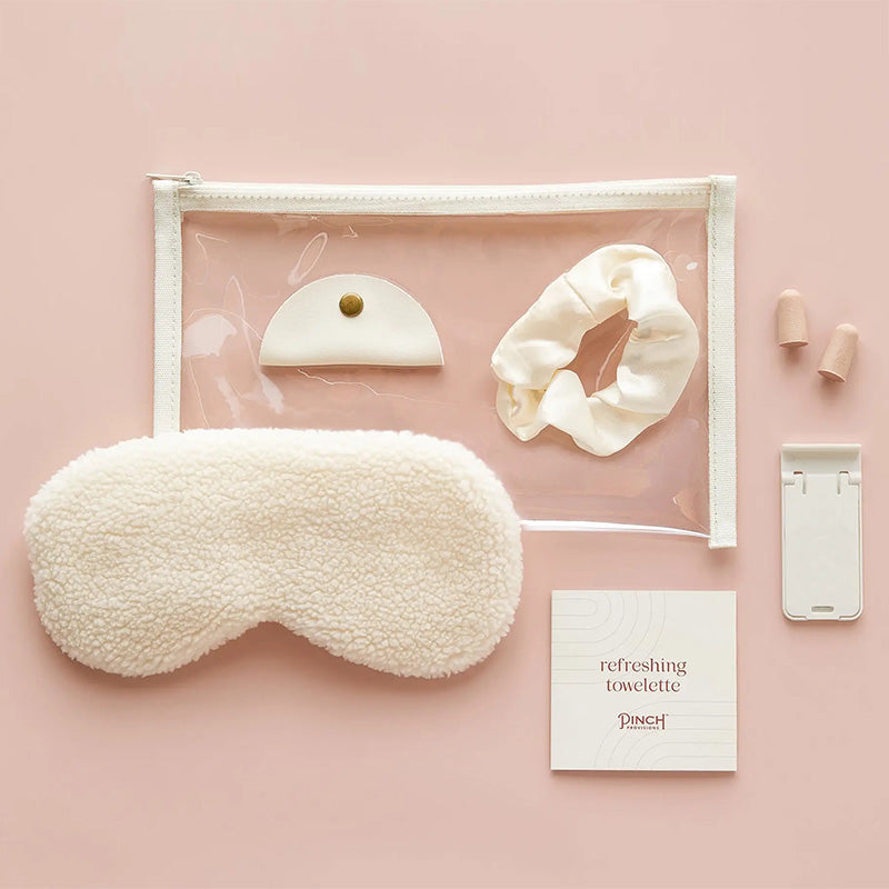 Rediscover the joy of travel with the new 7-piece Travel Set by Pinch Provisions. The clear zipper pouch contains a convenient assortment of practical luxuries. With room for additional items like a passport, ticket, or face covering, this Travel Set is a must-get for the modern jet-setter.