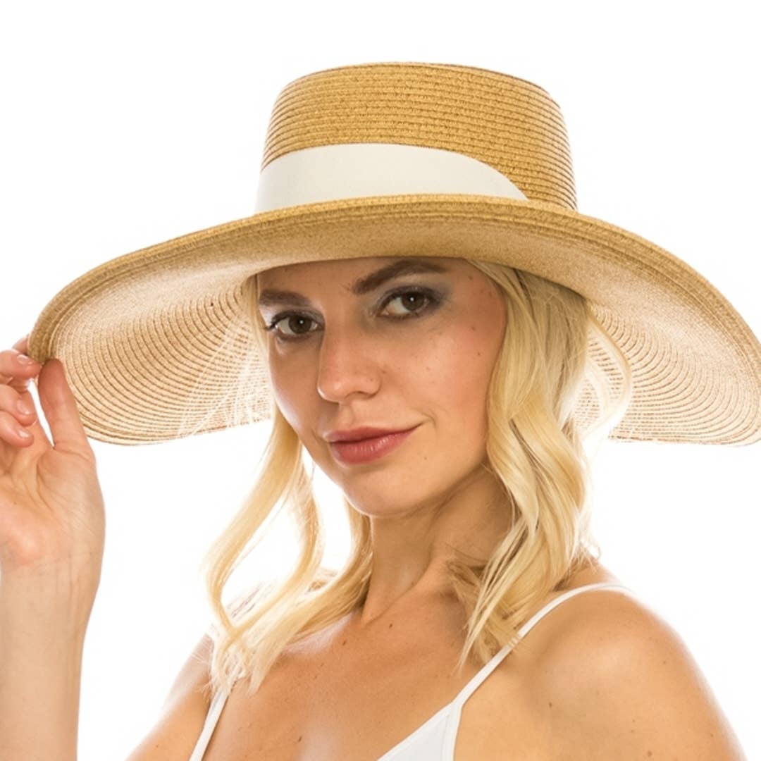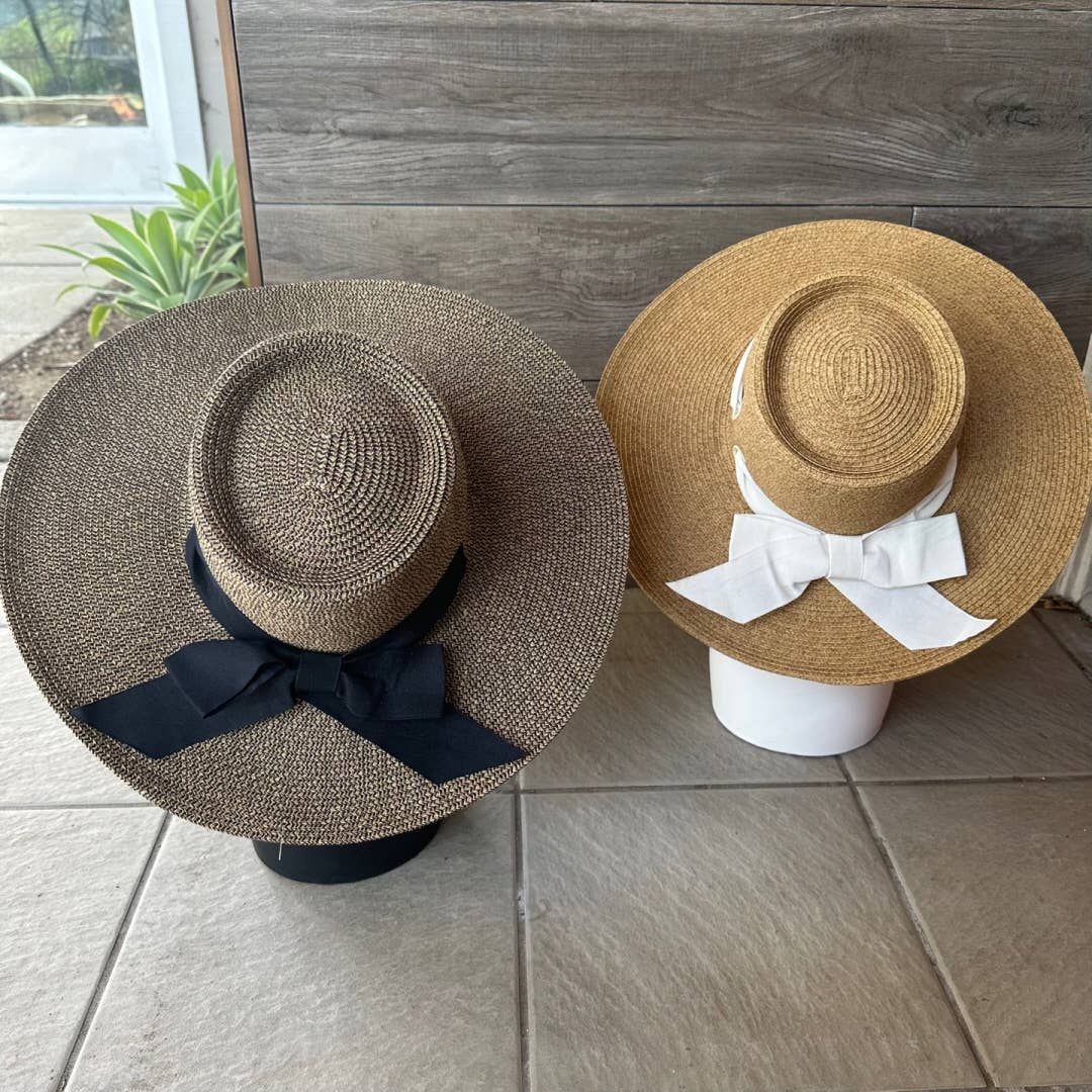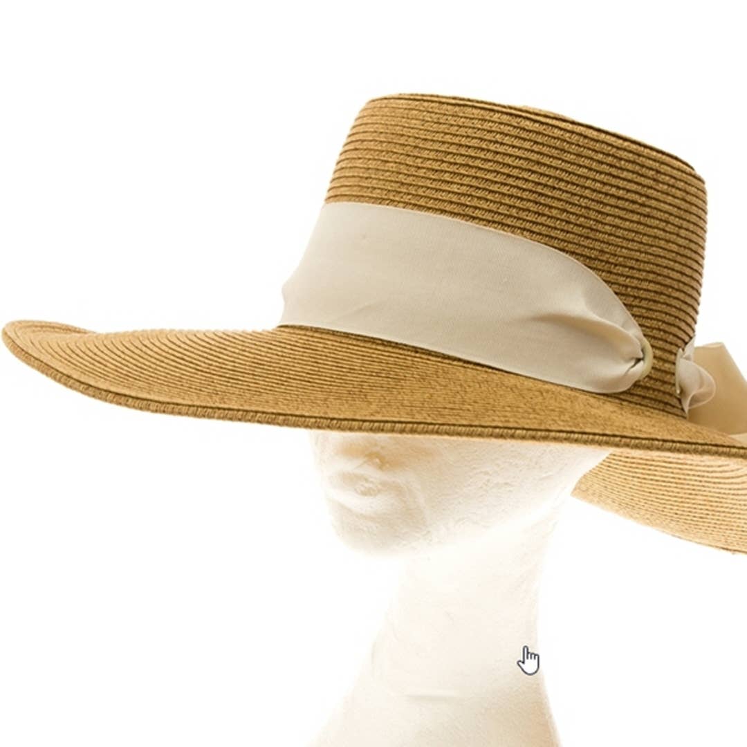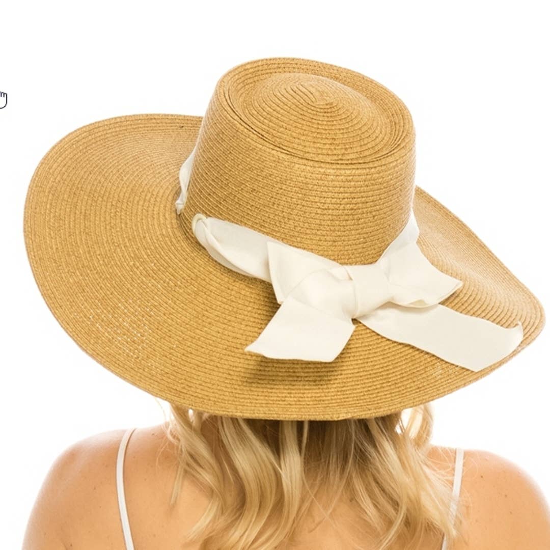 Wide brim sun hat with flat gambler crown. Grosgrain bow and eyelet detail.