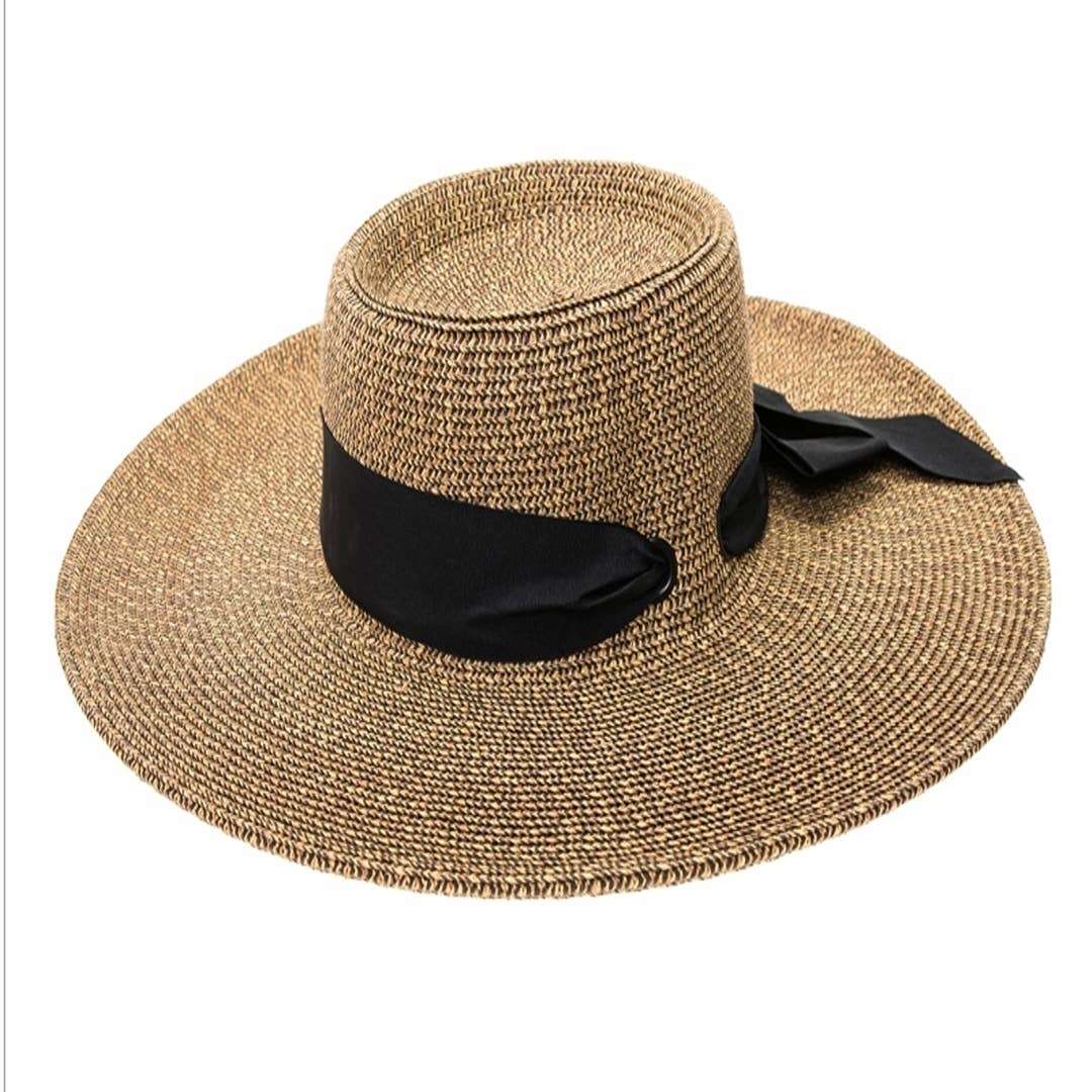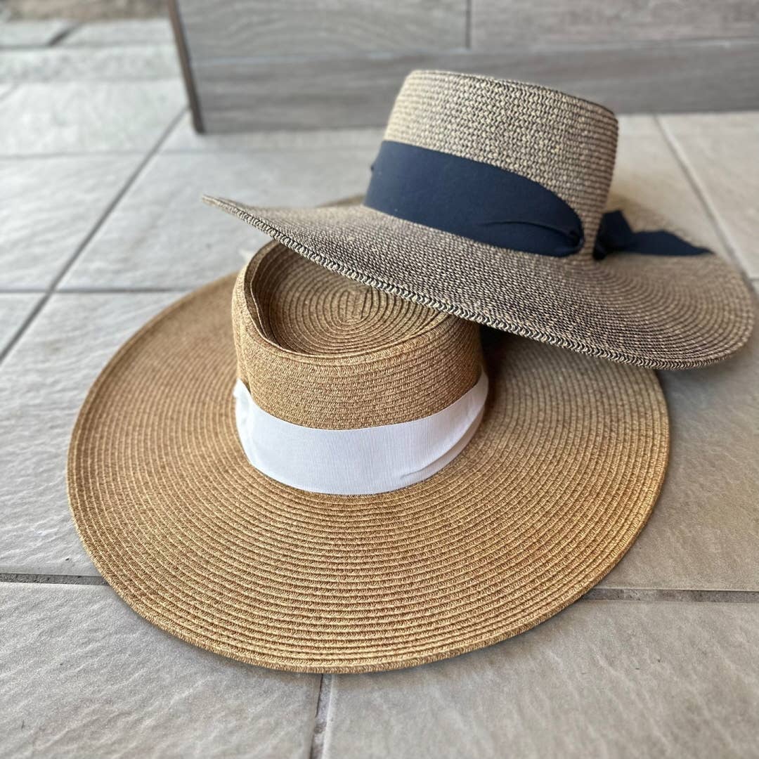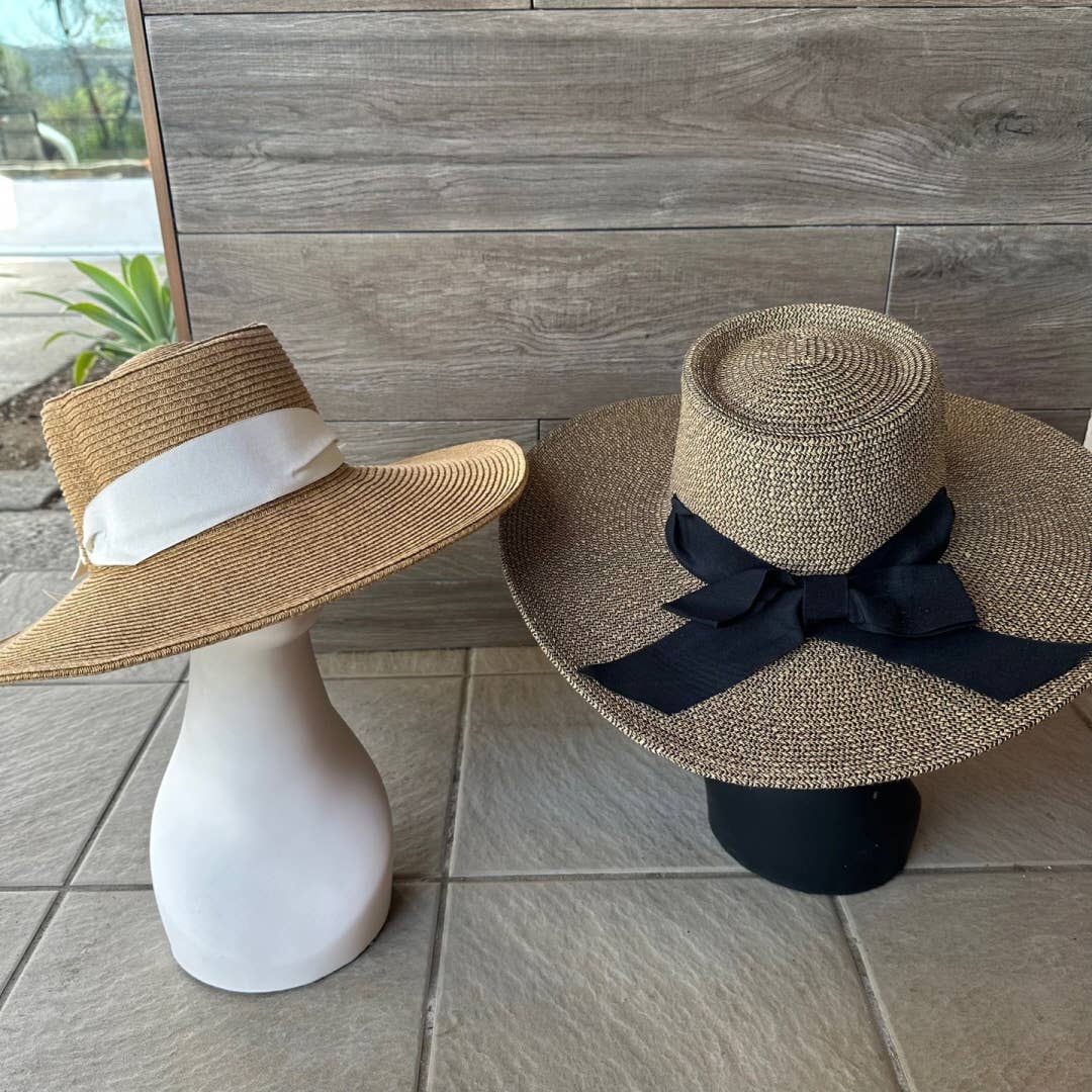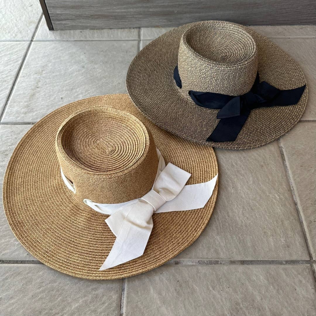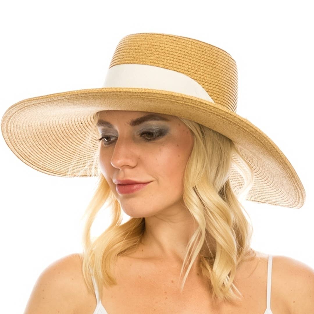 Wide brim sun hat with flat gambler crown. Grosgrain bow and eyelet detail.