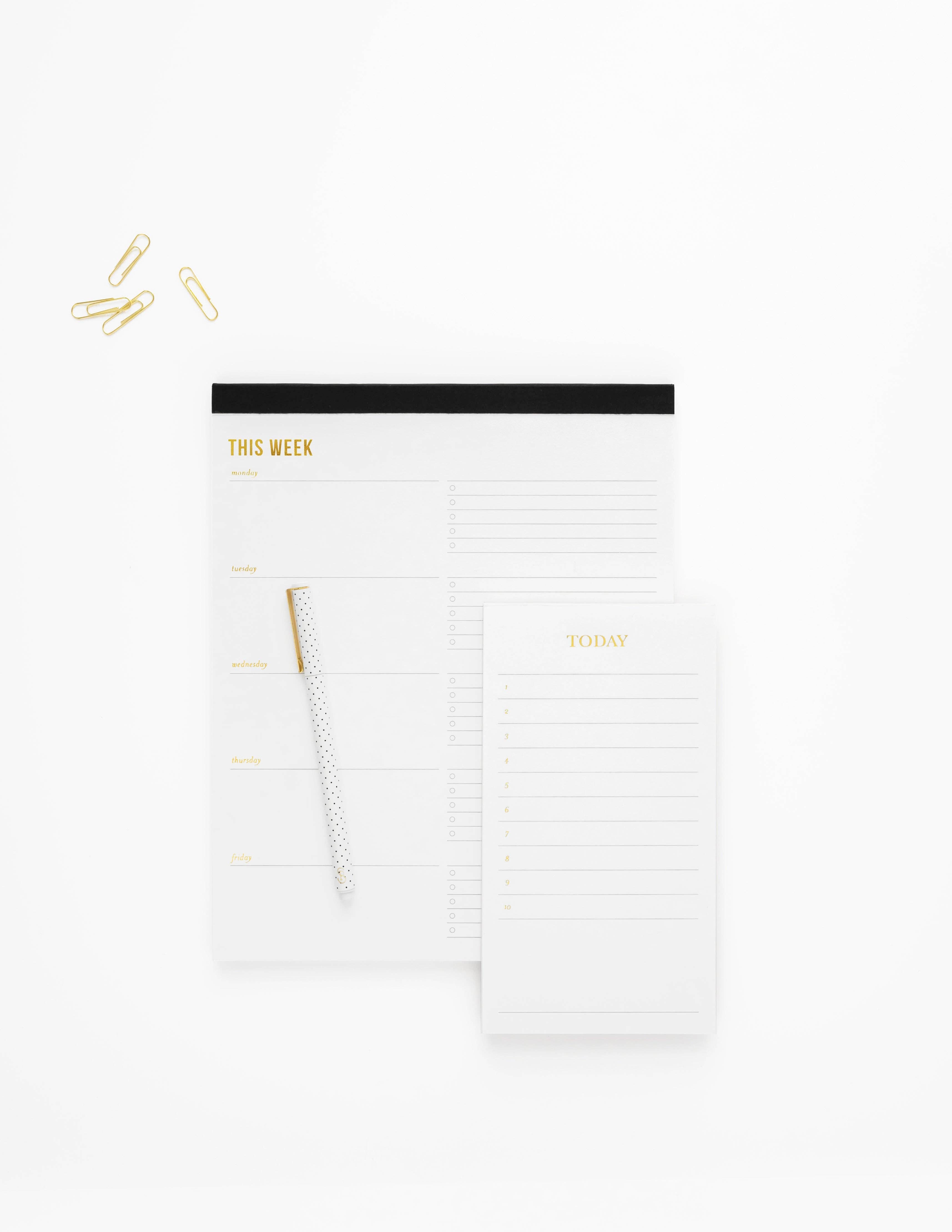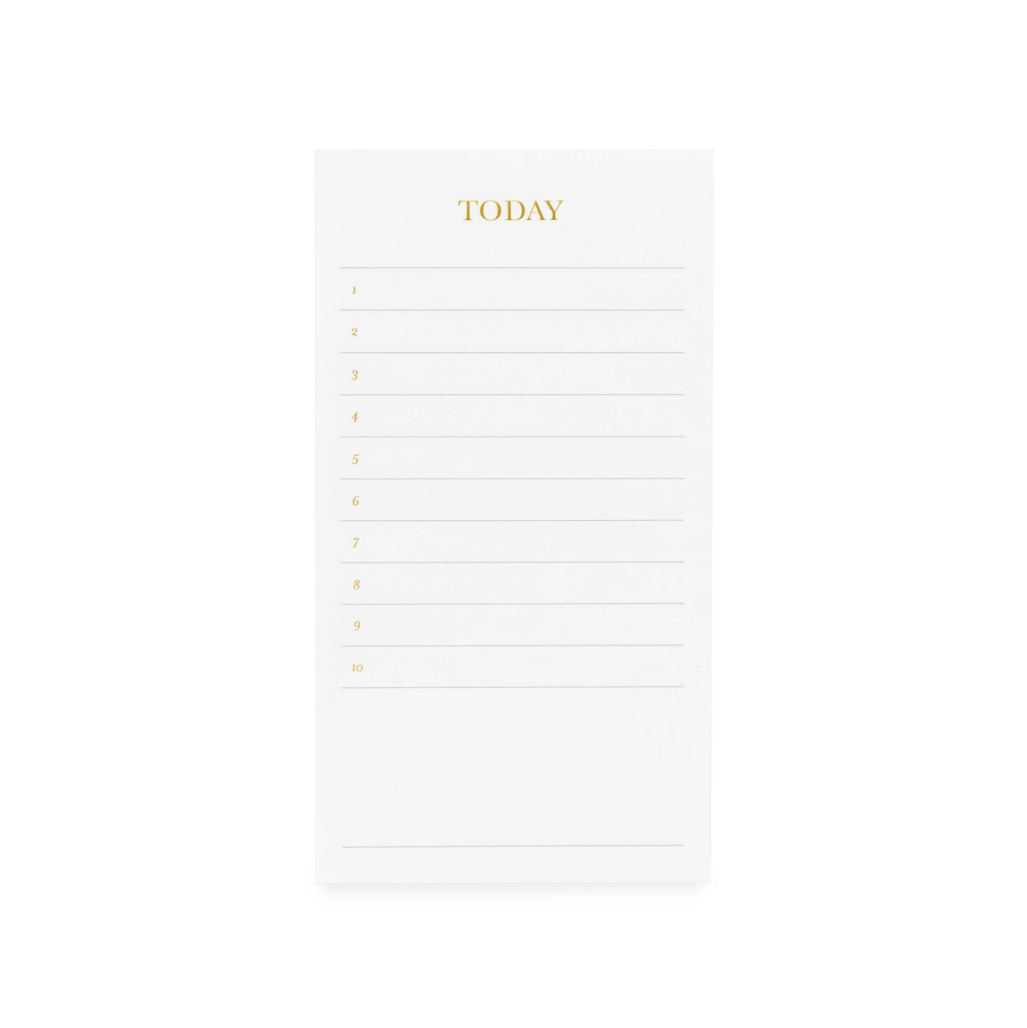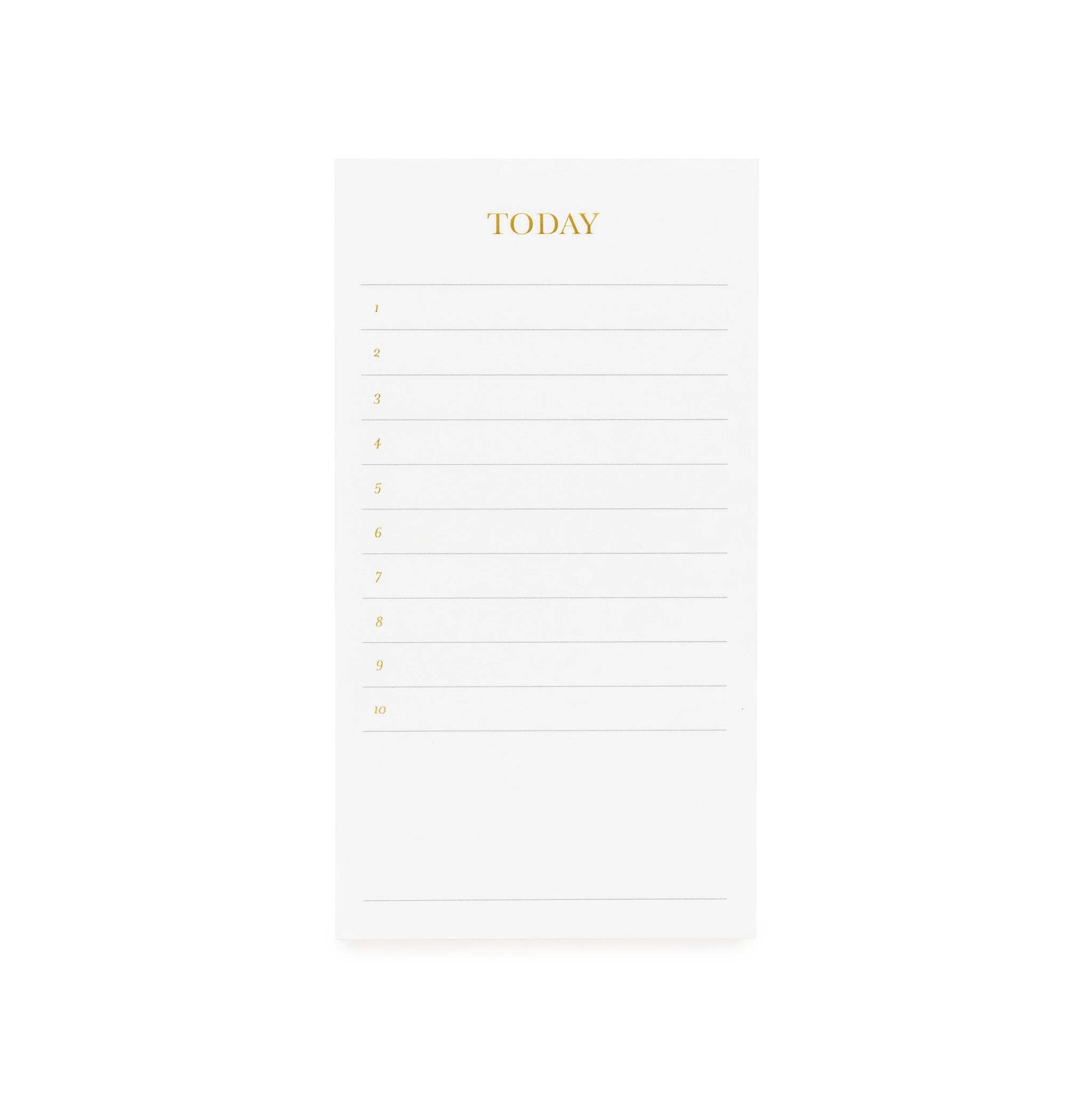 Our Today Pad in white helps you get what needs to be done, done. Ten numbered lines followed by a blank section to fill in everything on your daily list. Grey ink is printed on crisp white paper with gold foil details.