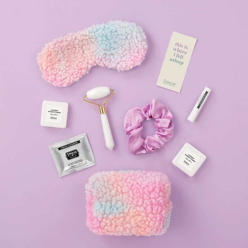 Make time to unwind with the cozy Wind Down Kit by Pinch Provisions. A super-soft sherpa pouch and sleep mask are accompanied by a full suite of soothing, me-time essentials.