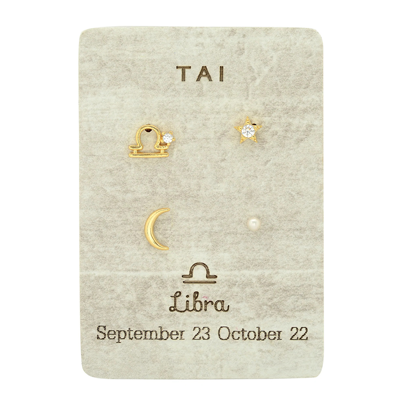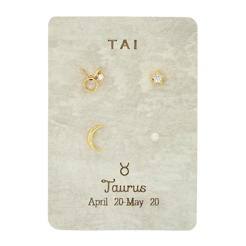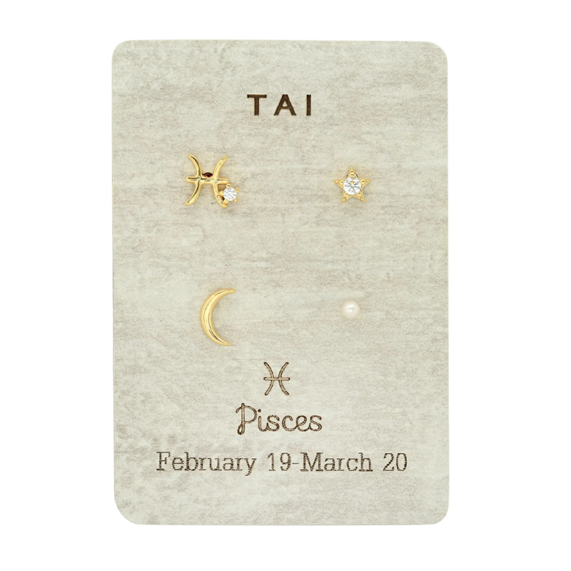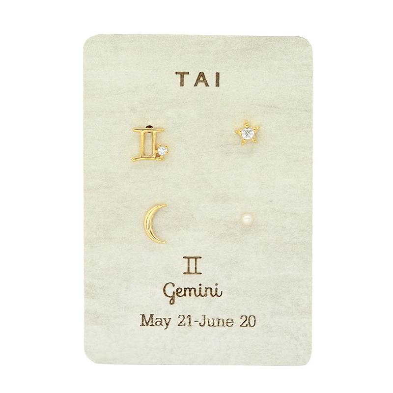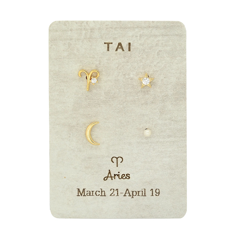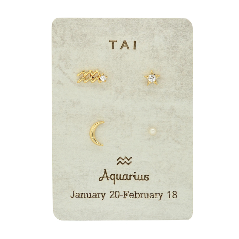 Mismatched stud pack that includes single zodiac sign stud, cz star, crescent moon and freshwater pearl studs