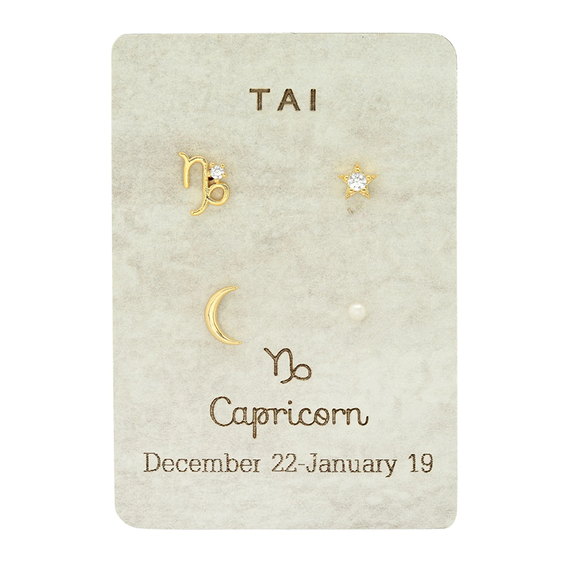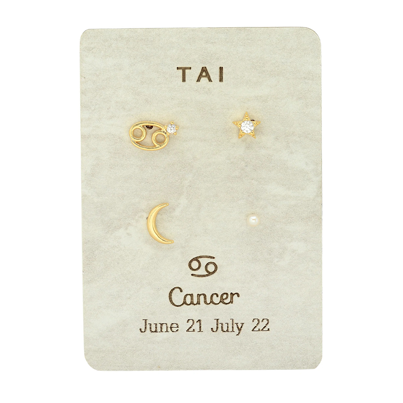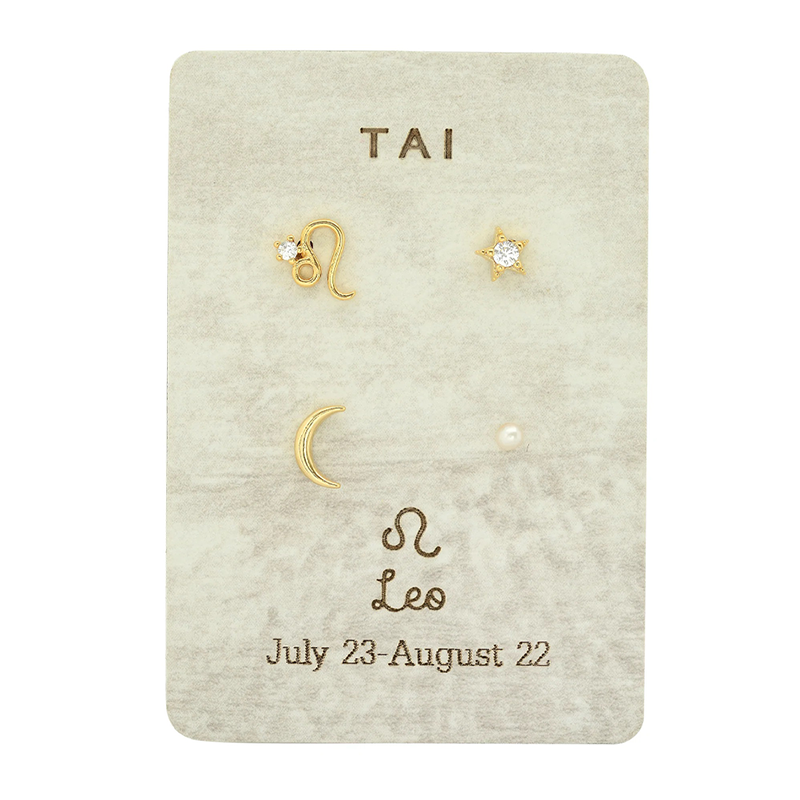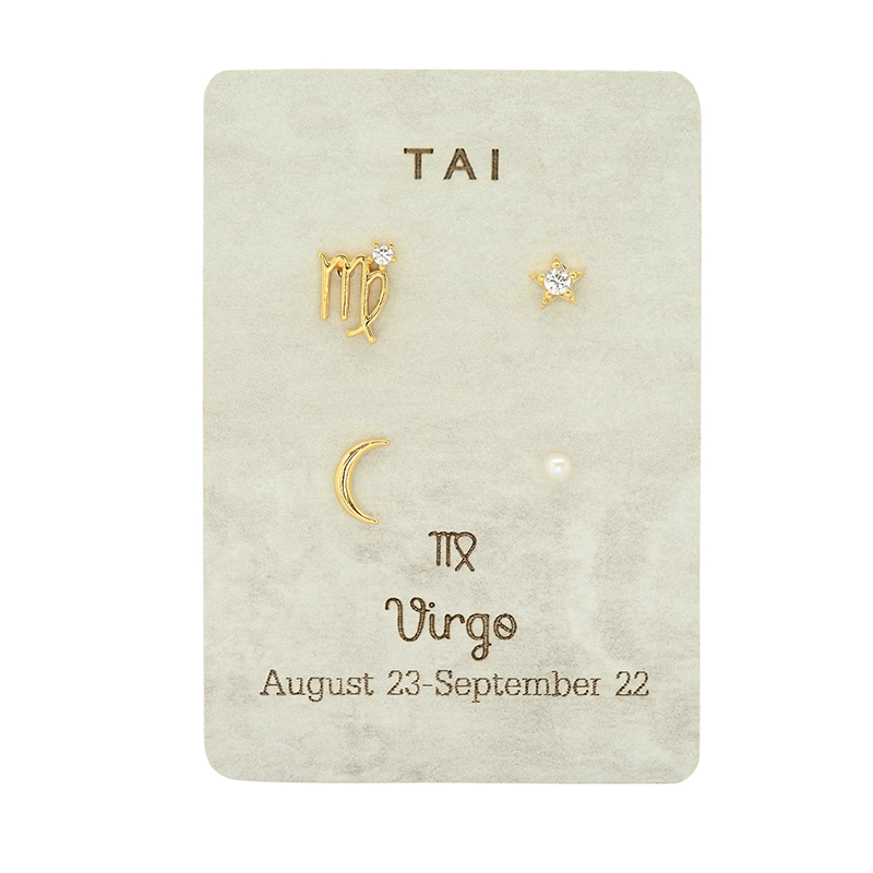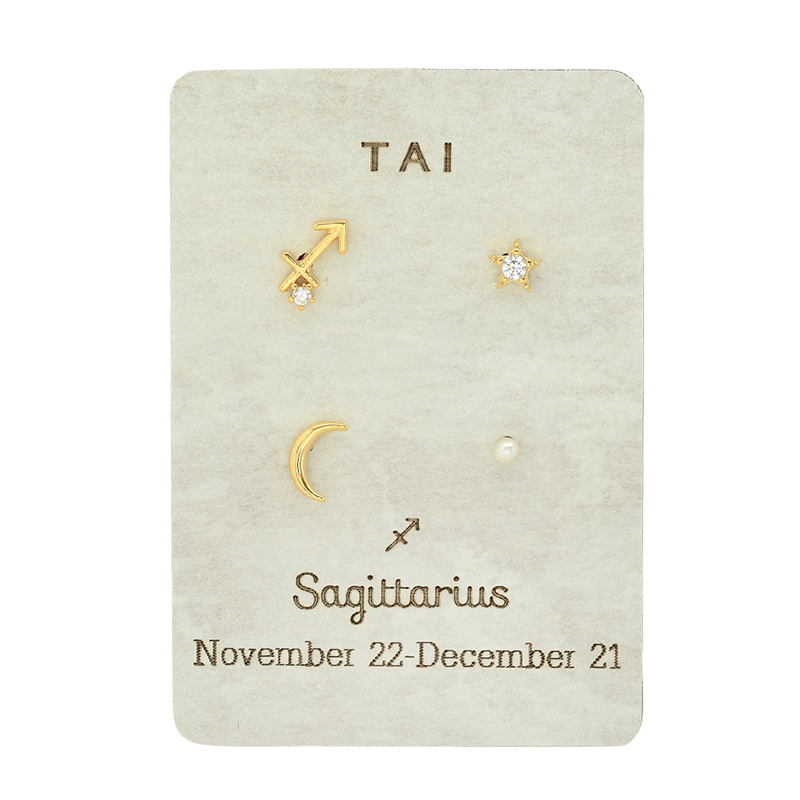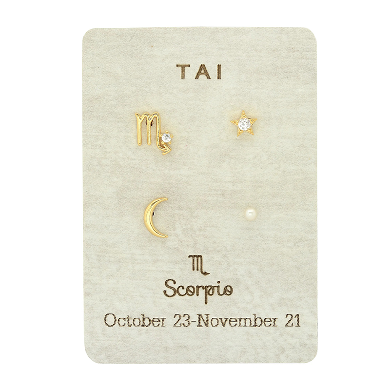 Mismatched stud pack that includes single zodiac sign stud, cz star, crescent moon and freshwater pearl studs