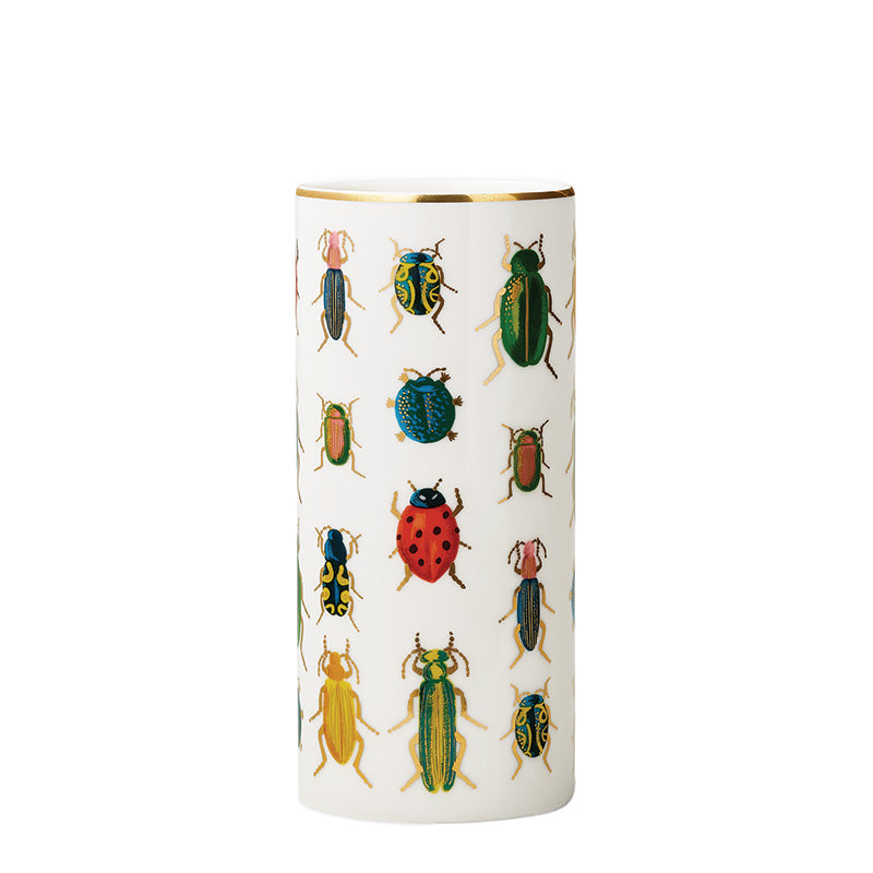 Ceramic vase printed with gold foil accents and colorful bugs and beetles.