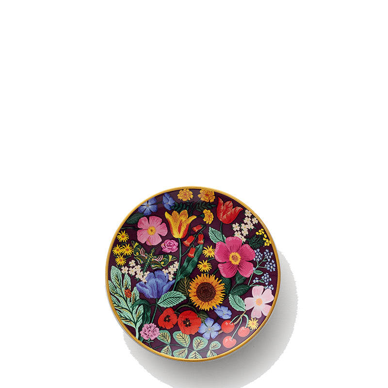 Keep this ring dish by your desk, the sink, or on your nightstand, and keep all your small, special things safe. The porcelain dish features Rifle Paper's illustrated Wildwood florals and a metallic gold rim for extra shine.