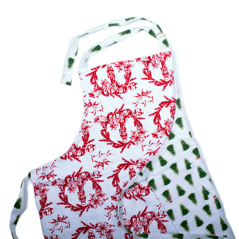 • Reversible style apron features red holiday toile print on one side & festive tree ditsy on the other!