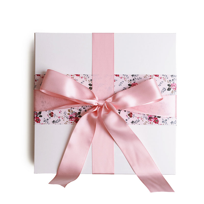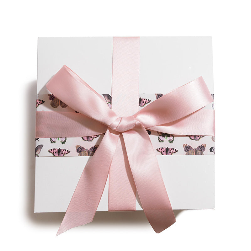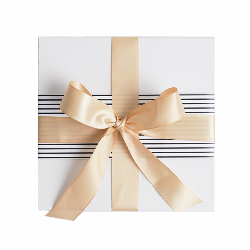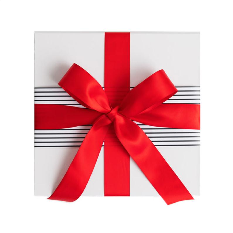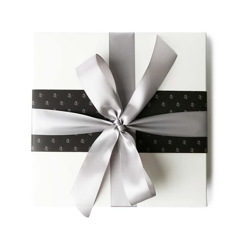 Gift box with a classic black and white B&B icon sleeve and an elegant silver bow.