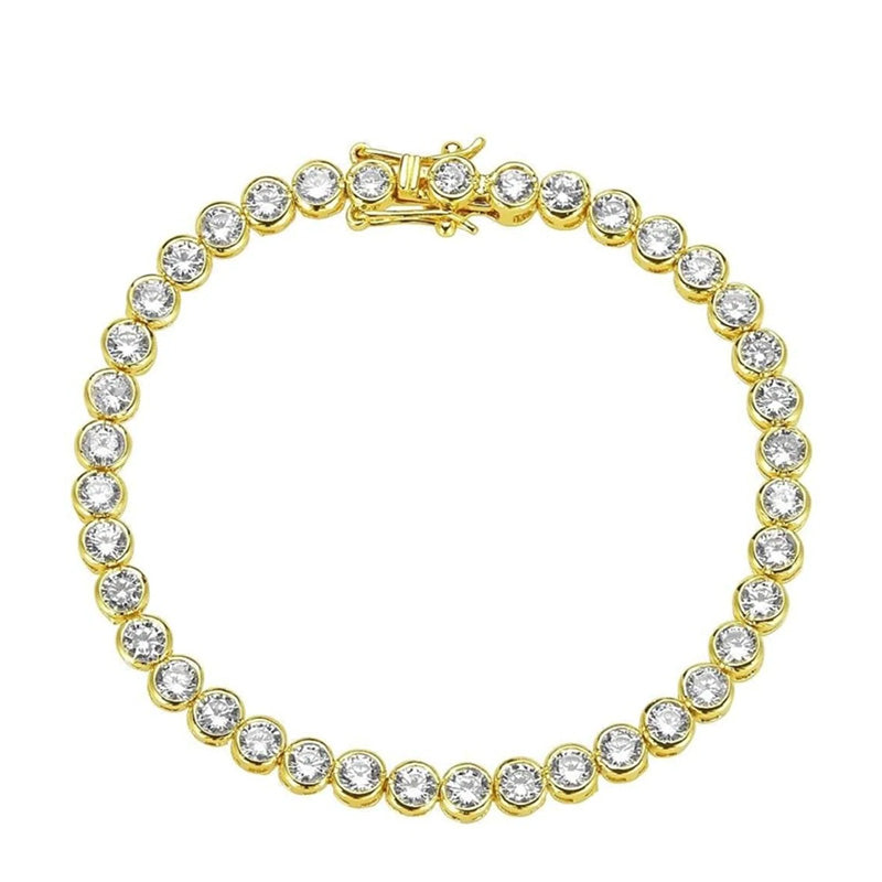 Melinda's cooler version of the old school tennis bracelet. 18k gold plated with bezel set stones. A handy snap closure.