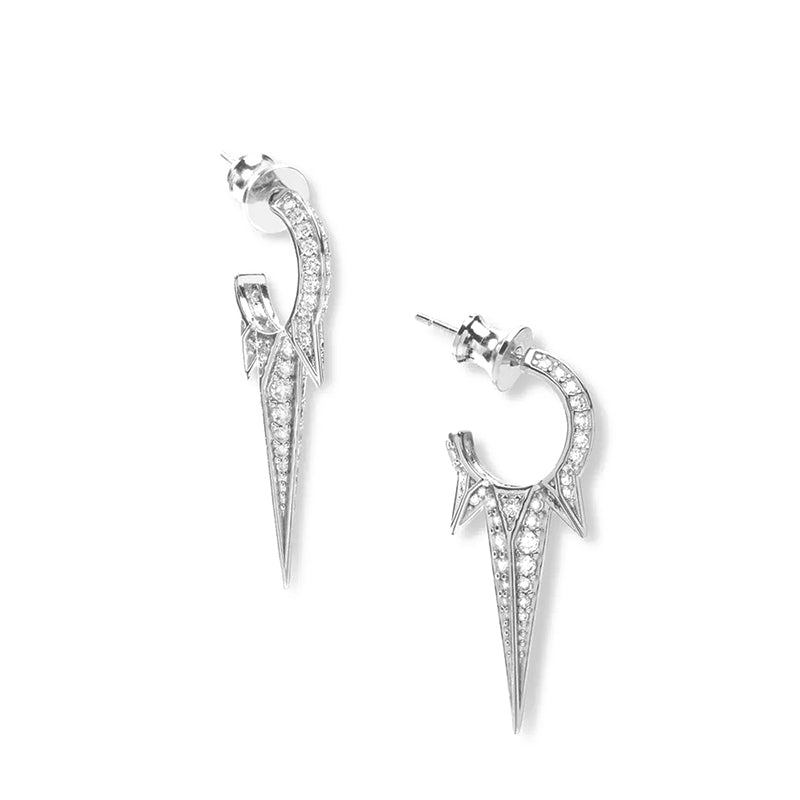 Always edgy, never fussy, Gabriella is THAT friend—the one who brings out your wild side. These 18K gold and silver plated triple spike huggies are covered in diamondette spikes for an even bolder look!