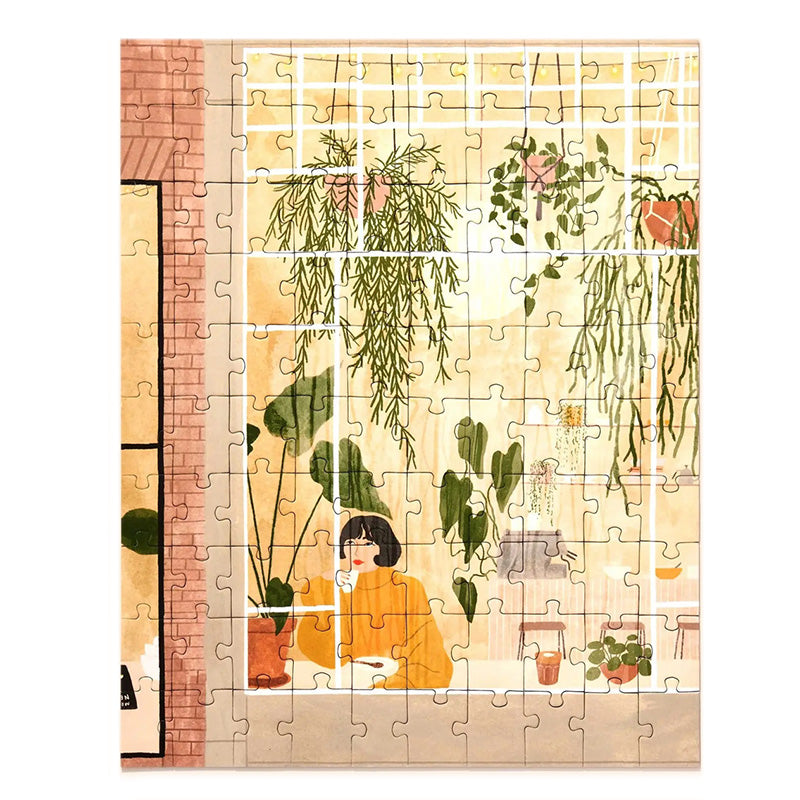 A serene setting greets passersby as they peer from the street into a peaceful café. Plants abound and the coffee keeps coming in this delightful scene of a coffee shop in Amsterdam by Rachel Victoria Hillis.