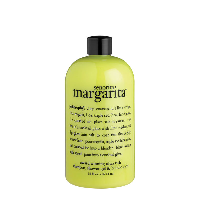 Bring happy hour to your shower with senorita margarita shampoo, shower gel & bubble bath. Philosophy's multitasking, 3-in-1 shower gel gently cleanses and conditions skin and hair, all in our refreshing lime margarita scent.