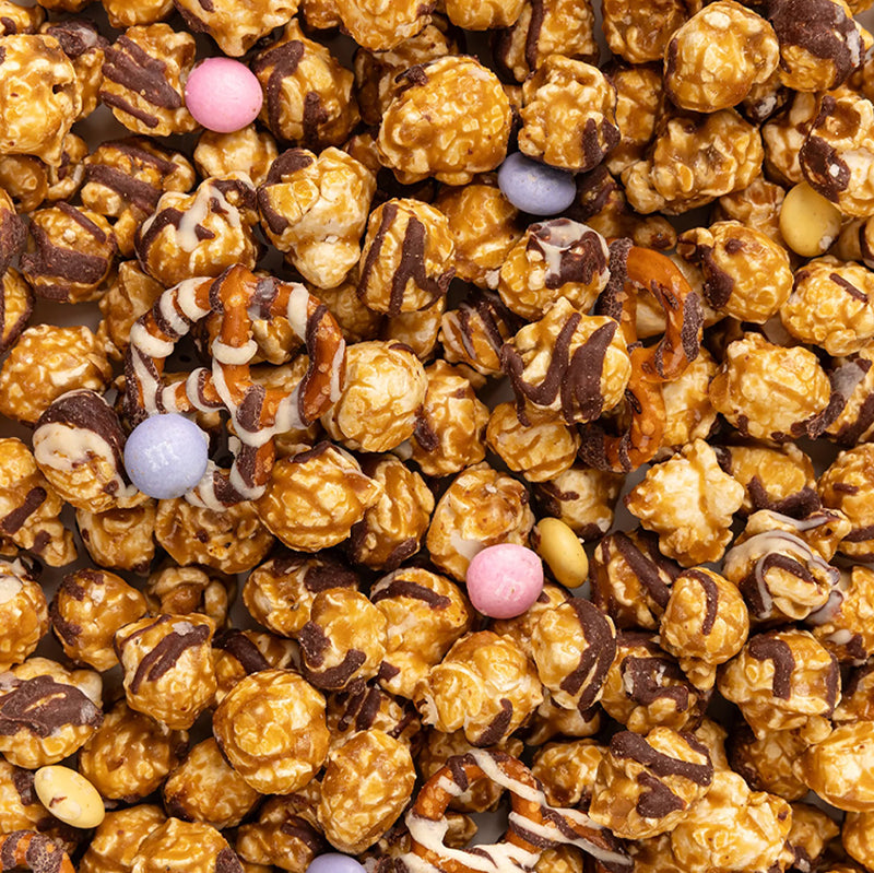 Poppy's famous Salted Caramel popcorn with caramelized pretzels, drizzled in craft French Broad Chocolate™ dark & white chocolate, and sprinkled with pastel M&M’s.