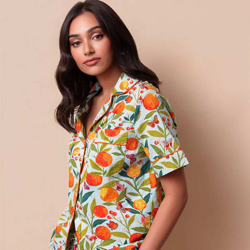 Citrus and butterfly lovers alike rejoice for a fruit-inspired print perfect for the bloom of spring. The Butterfly Grove features an assortment of colorful insects on fan-favorite organic cotton pjs for heart-fluttering sweet dreams.