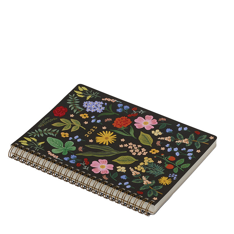 This softcover spiral planner features a textured paper cover with a full-color floral design and a gold foil year. The new weekly view includes a full page for notes and lists on every spread. In addition, there are sections for monthly views, contacts, celebrations, and pockets for storage.