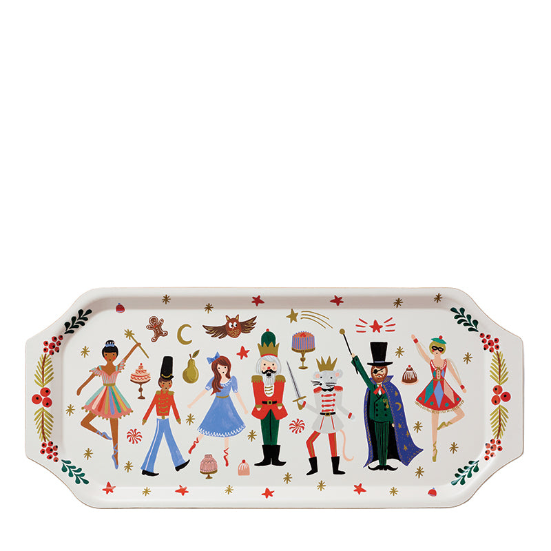 This bent ply tray is as versatile as it is beautiful, handmade in Sweden from lightweight, FSC-certified birch. The laminated finish makes it perfect for holiday entertaining or displaying your favorite festive décor. This rectangular tray is just the size for leaving cookies out for Santa, and features a few well-loved characters from the classic Nutcracker Ballet.