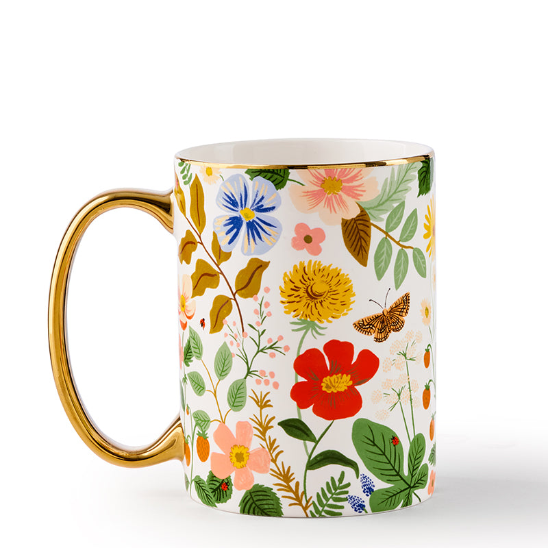 Butterflies flutter among blooms and leaves that pop against a cream backdrop on our Strawberry Fields mug. Rifle Paper's porcelain mugs feature illustrated designs and a gilded rim and handle to add a little something special to your favorite beverage.