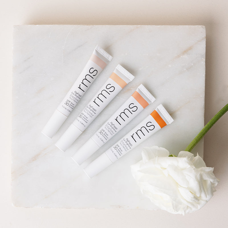 - Gently blend with fingertips or the RMS Beauty Skin2Skin Concealer Brush for detailed application close to the eye.