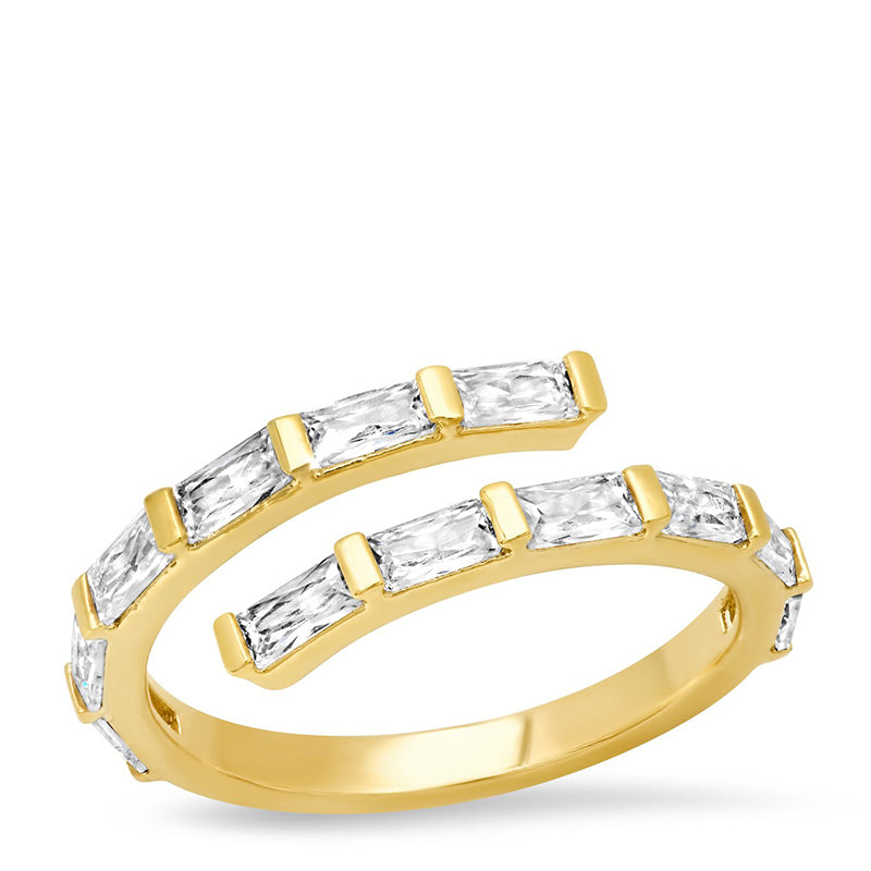 Looking for a simple, elegant ring that will add a bit of sparkle to your everyday? This wrap-around ring covered in CZ baguette stones is exactly what you need.