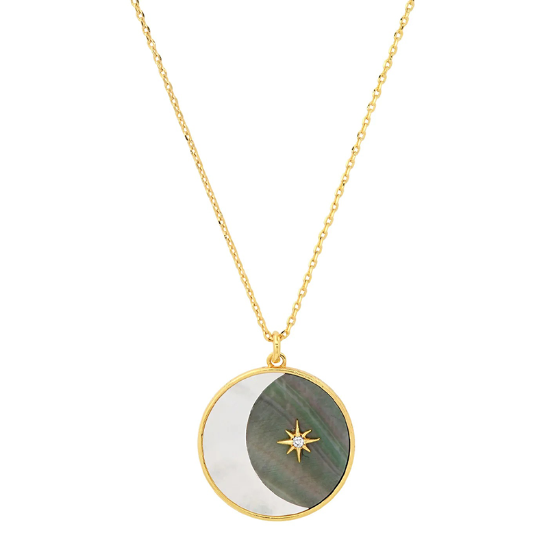 Round pendant featuring mother of pearl and abalone with the perfect touch of celestial bodies.