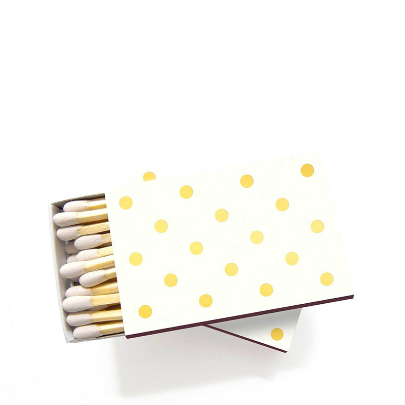 Matte white matchbox with gold foil. Double sided and packaged in clear cellophane.