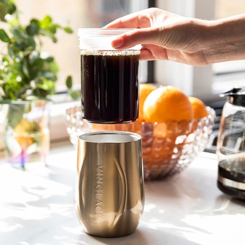 Vinglacé Wine Tumblers are Stainless outside - Glass inside, so no more metallic taste or smell. Now you can keep your wine chilled without sacrificing taste. The glass insert is dishwasher safe and comes with a sip through lid.